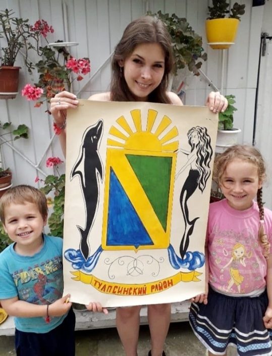 – Из-за карантинных мер мы с детьми вынуждены находиться дома, но совсем не скучаем без дела, – поделилась с газетой мама малышей Ангелина. – Воспитываем ребятишек и рассказываем им, в каком чудесном месте живём. Даже записали видео: дети читали стихи и мастерили поделки, а мы всей семьёй (тут и самые старшие взяли в руки кисти: вот оно, творчество трёх поколений!) нарисовали герб. На ватмане – герб с щитодержателями: дельфином-афалиной и утончённой нимфой – русалкой. По форме – французский щит, который увенчан солнечной короной и опирается на узел Древа Жизни – символа времён: прошлого, настоящего и будущего. Это – один из первоначальных проектов, в авторской группе которого выступили туапсинцы: историк и известный геральдист Василий Сапелкин, к сожалению, не доживший до юбилея района, а также художник и краевед Александр Стеблецкий.