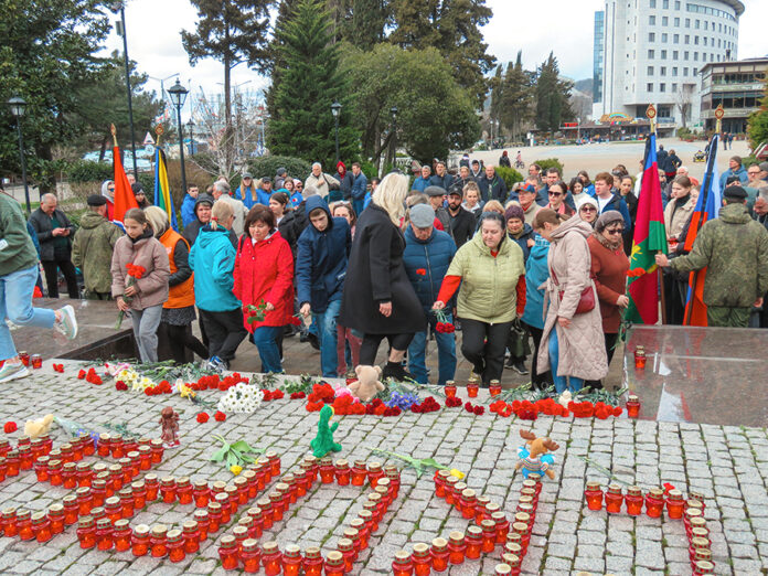 В полдень горожане собрались у знакового для туапсинцев места – стелы «Город воинской славы». Из зажжённых лампад на постаменте памятника волонтёры выложили надпись «Туапсе скорбит».